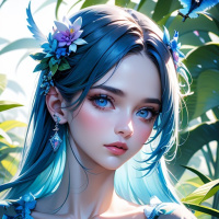blue headband or accessory with feathers and what could be flowers or decorative elements. She is also wearing a detailed costume that seems to have a fantasy theme; the colors include shades of blue, green, and white, which are complemented by