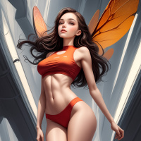 illustrated character that appears to be a female with wing-like appendages on her back. She has an athletic build and is wearing a red