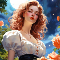 a full moon visible in the sky, enhancing the nocturnal ambiance of the scene. The style of the illustration is detailed with attention given to the character's features and