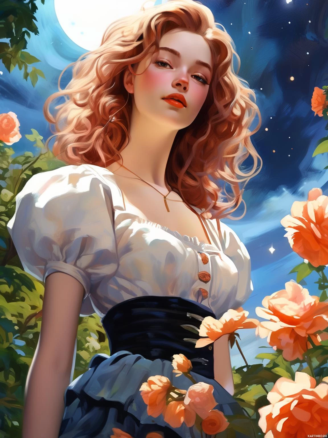 red hair. She is wearing a corsette and an apron, which could suggest a historical or