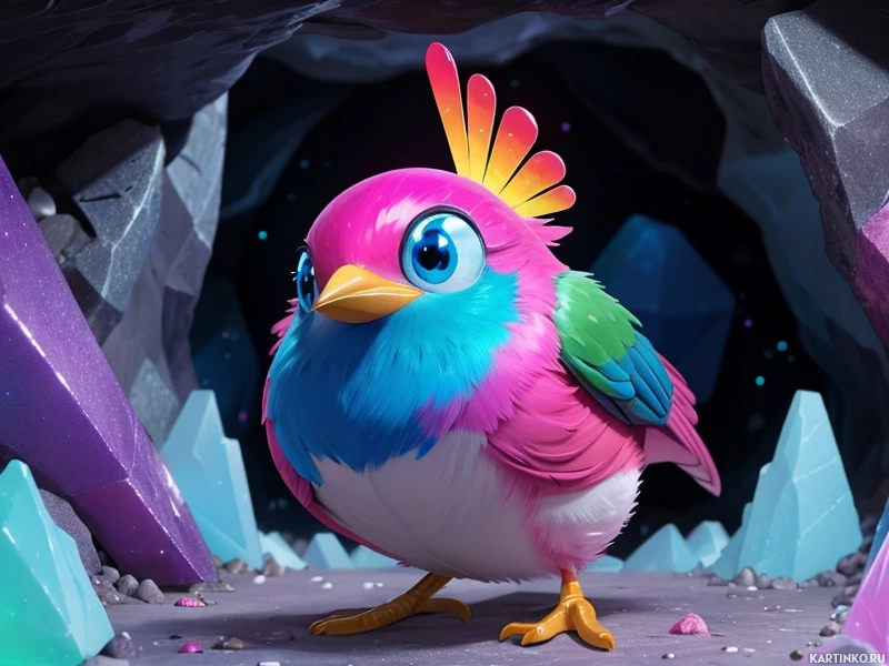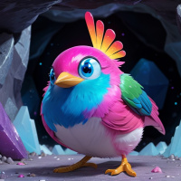 various colors such as purple, blue, green, and yellow. The bird's head seems to have a pattern or perhaps some kind of decoration on it, which gives the impression that it could be a character from