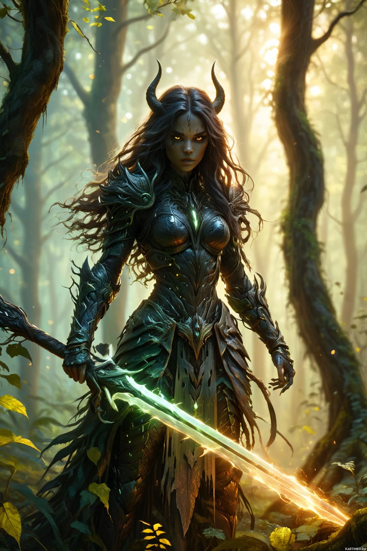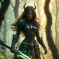lush with greenery, indicating that she could be in the midst of a forest or woodland area. Her stance and attire give off