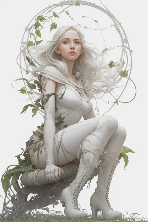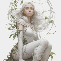 a female character with white hair. She is seated and appears to be in a contemplative pose, surrounded by green foliage that suggests