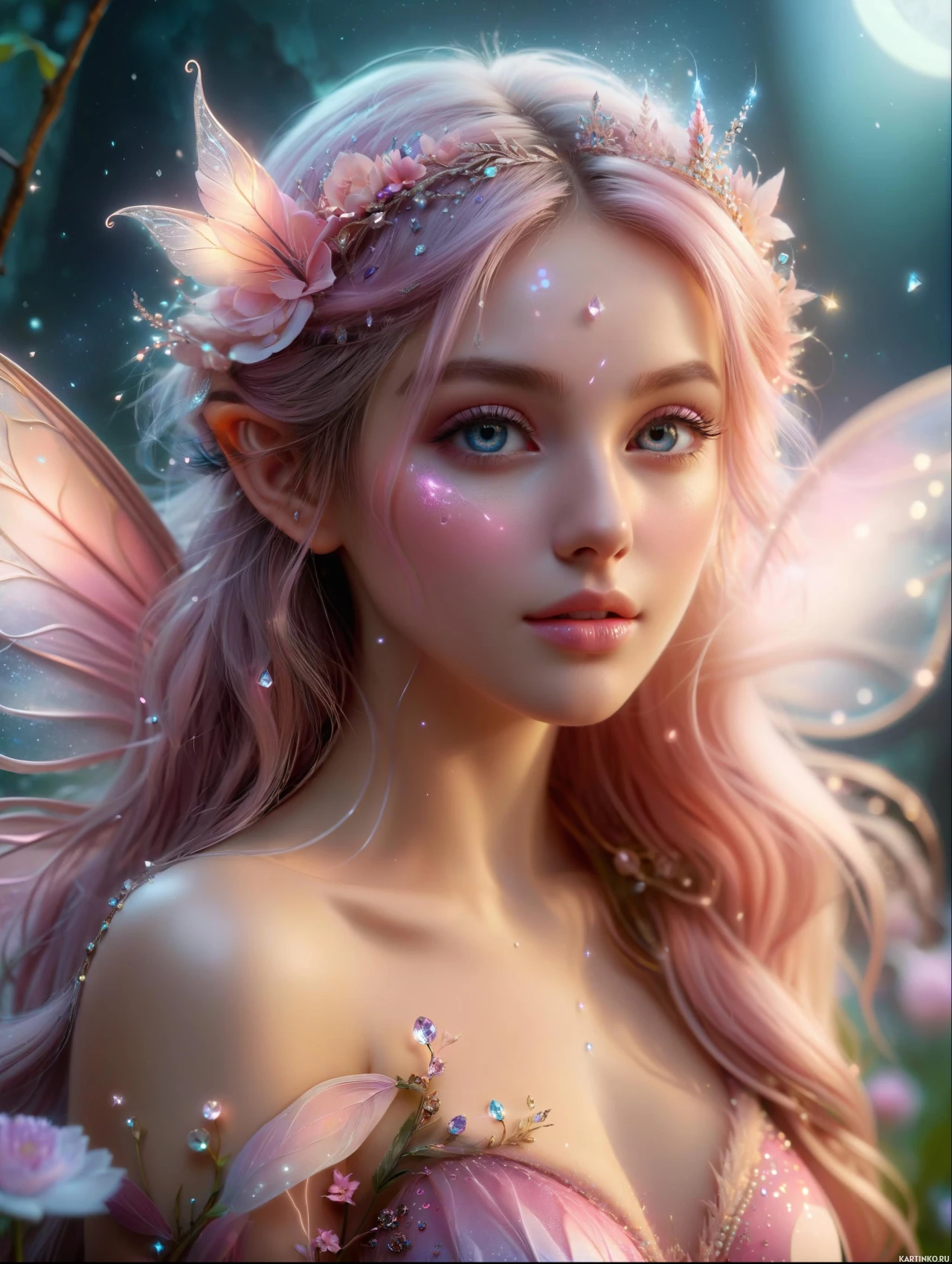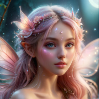 expressive eyes and is adorned with elements characteristic of fantasy genres. Her attire consists of a tiara, wings, and what appears to be a magical or mystical garment. The background suggests a night-time setting with
