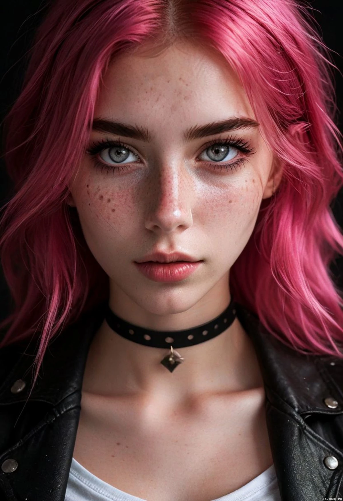 The image features a person with pink hair that falls over their eyes and onto their shoulders. They have prominent blue eyes and what appears to be a neutral expression on their face. The individual is wearing a black leather jacket or top, which has visible studs along the edges, suggesting a punk or alternative style.