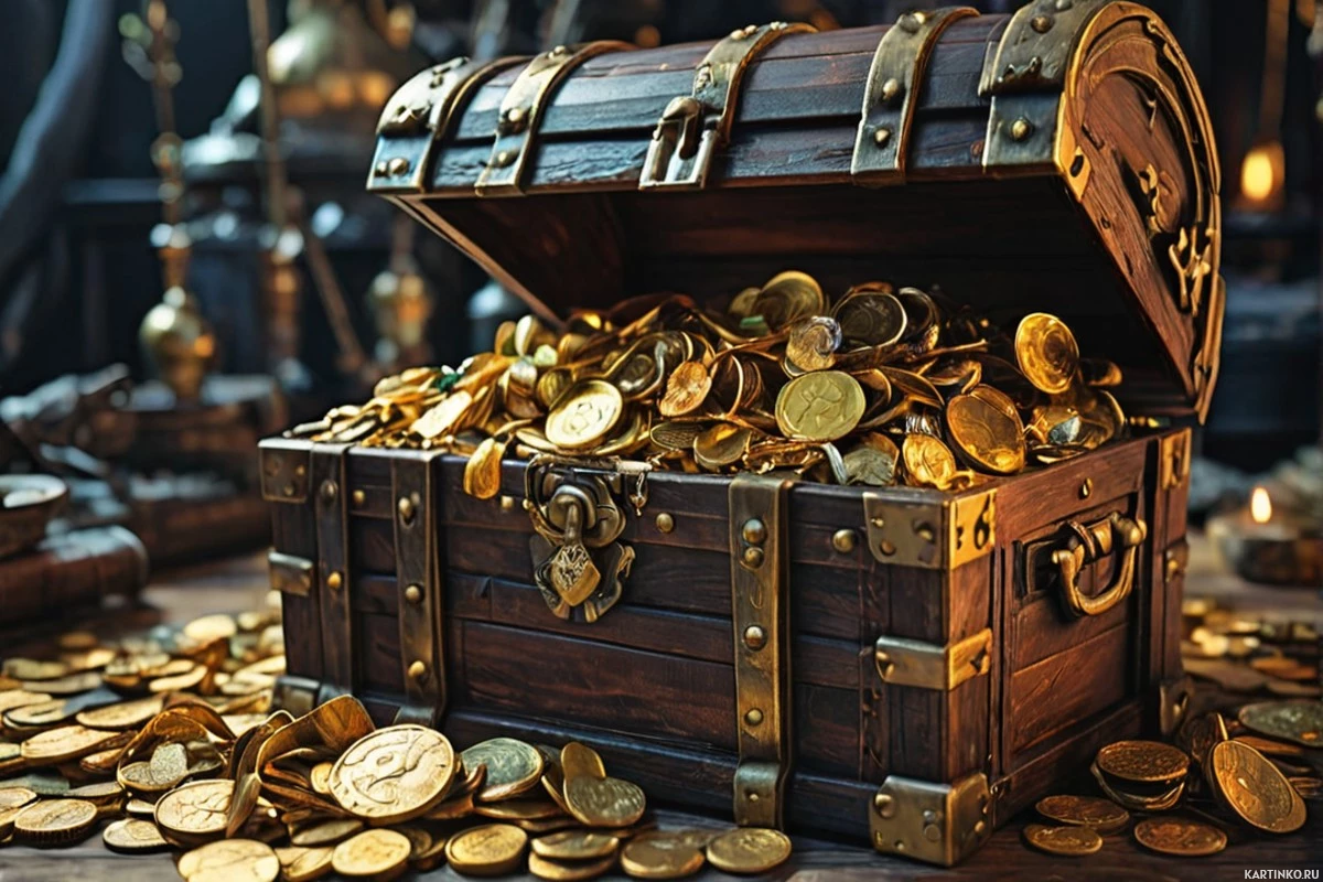 The image shows a large treasure chest overflowing with