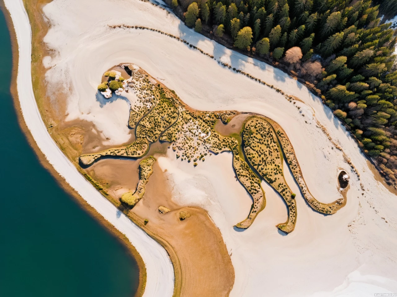surrounding environment includes elements typical of such settings: the sea, possibly inlets where water flows through the sand, and vegetation along the edges. The overall scene suggests a well-maintained coastal area with landscaping efforts that aimed to create a visually striking representation of an animal within