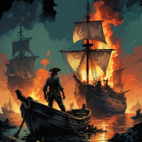 the burning ships. This individual appears to be observing the chaos unfolding before them. On either side of