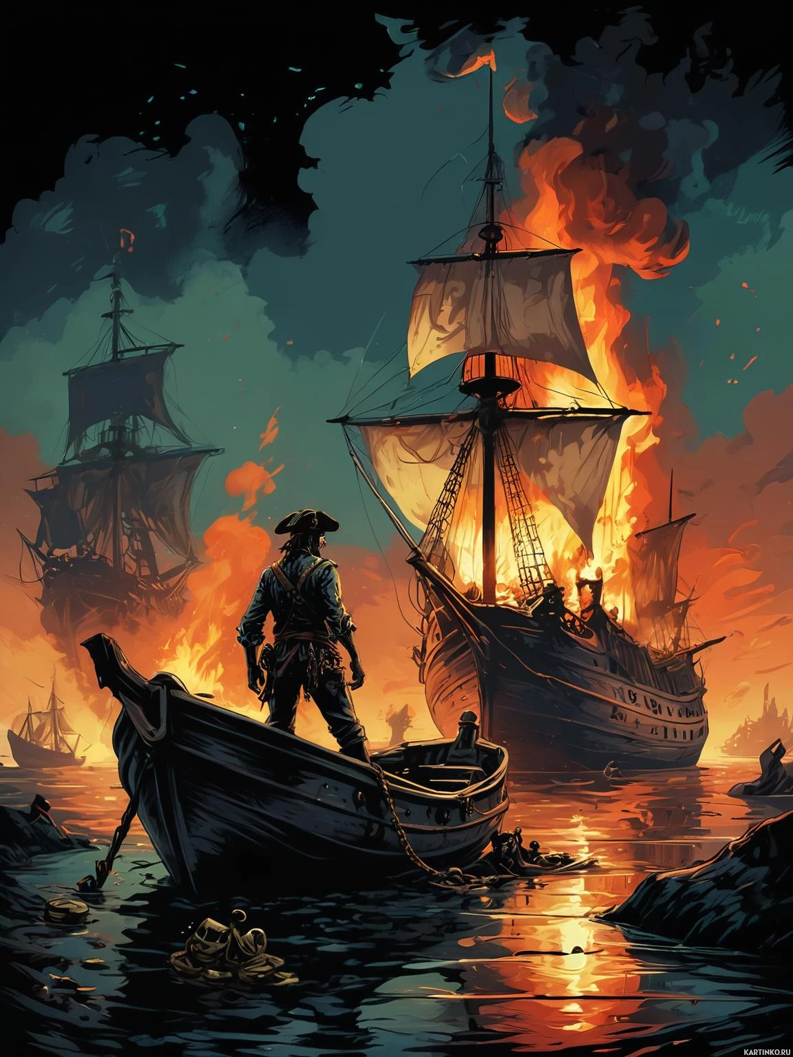 a dramatic scene at sea with two ships ablaze. In the foreground, there is a person standing in a small rowboat looking out towards