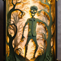 the eerie atmosphere of the scene. The overall style is reminiscent of papercut art and the genre could be described as horror-themed due to the use of elements commonly associated with zombies or