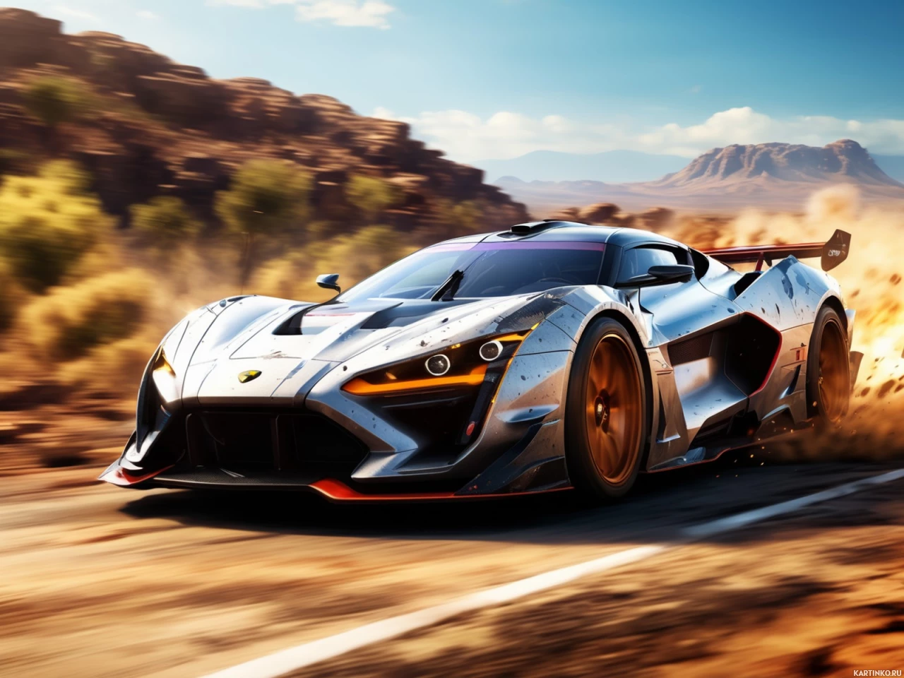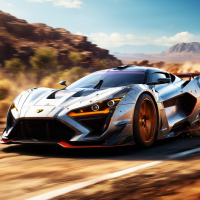 sports car in motion on a desert road. The vehicle has a sleek design with aerodynamic features and prominent headlights that suggest