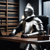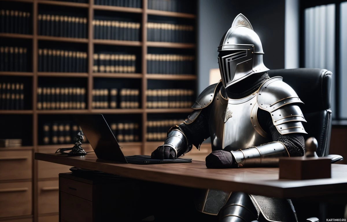 medieval armor, including a helmet with an open visor, sitting at a desk and using a laptop. The setting appears to be