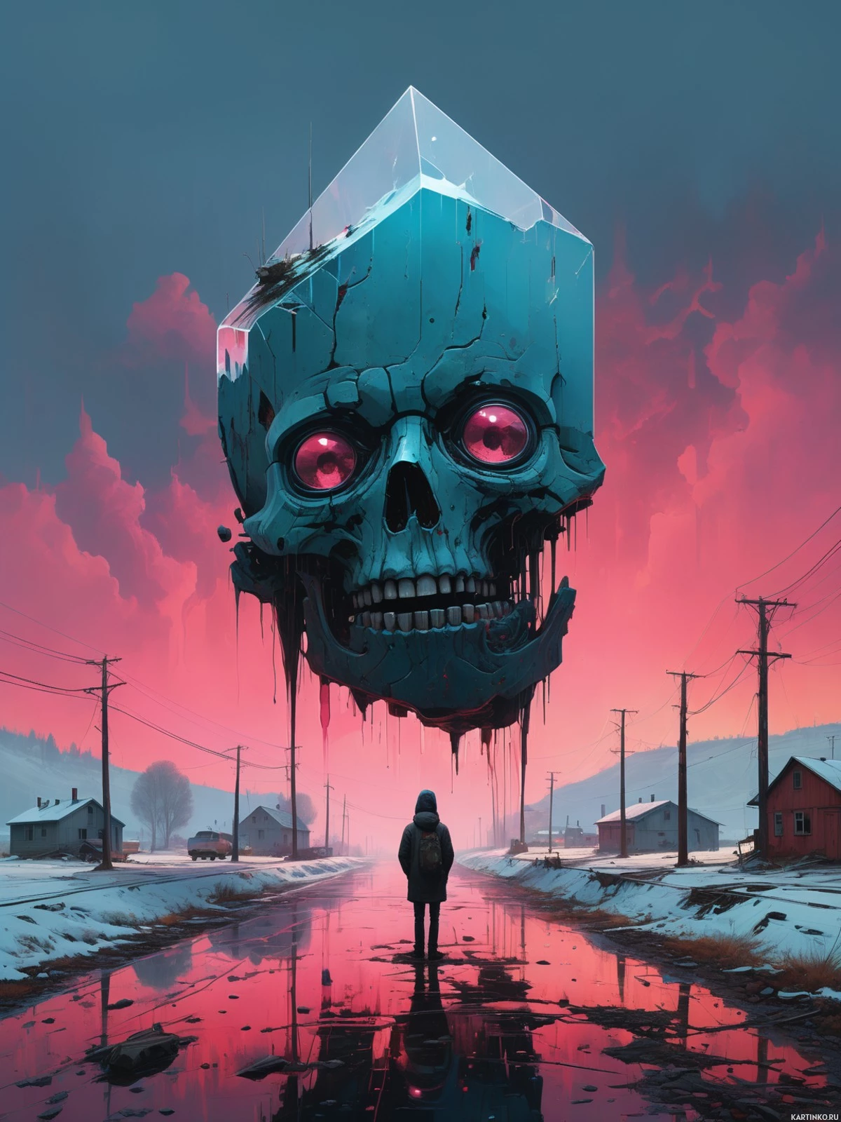 red eyes, floats in the sky as if it were an explosion or a spaceship. The skull appears to be made of ice or crystal-like material, with droplets or cracks indicating melting or weakness. Below the floating skull, there is a person standing on the side of