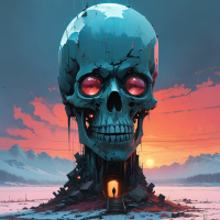 natural backdrop stands a skull on a pedestal or structure that resembles a pillar or an obelisk. The skull is anthropomorphic in nature, featuring red
