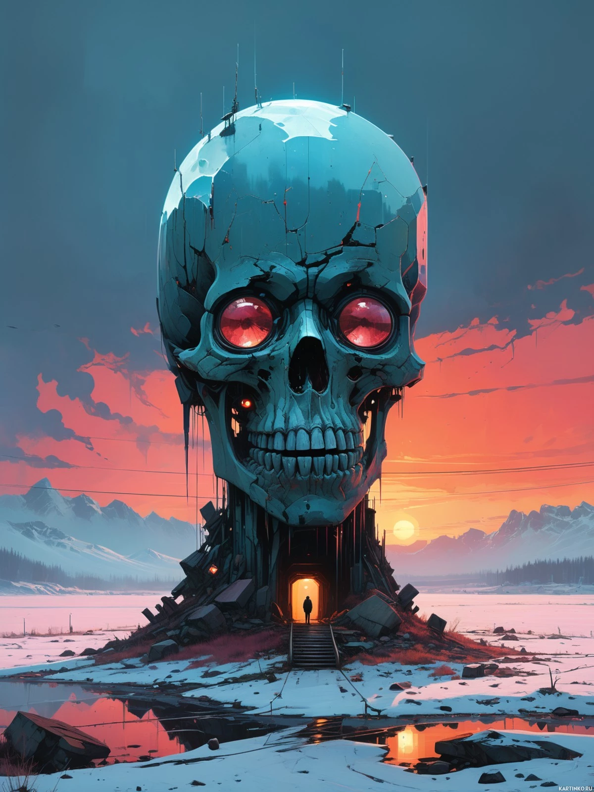 a solitary figure who seems to be observing or waiting at the entrance. The overall atmosphere is one of mystery and otherworldly strangeness, with elements that might be associated with death or supernatural realms due to the presence of the skull and