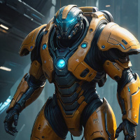 robotic exoskeleton that is painted in a bright yellow color with black accents. This exoskeleton has a humanoid form and appears to be equipped with multiple