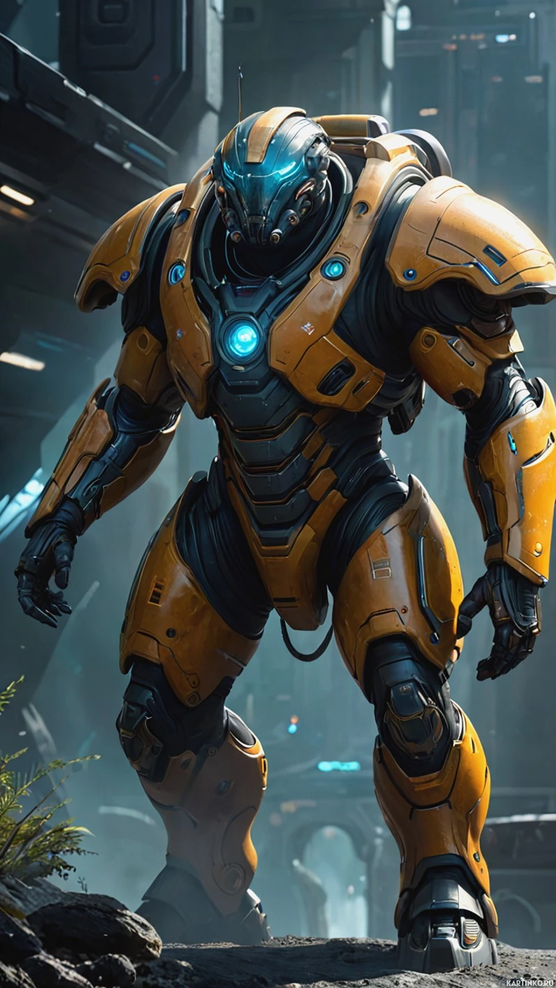 fiction setting, which includes structures that resemble corridors or pathways often seen in such themed artwork. The robot exudes a sense of robustness and readiness for combat or