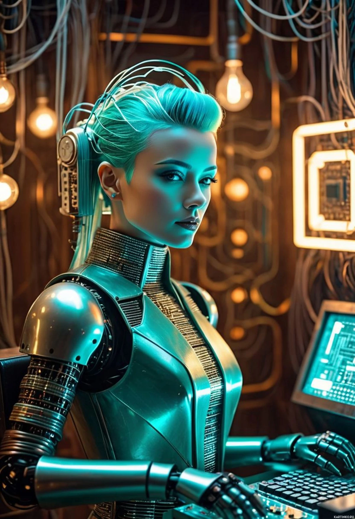 an electronic interface on her forehead and is sitting at a desk with computer equipment around her. Her expression is calm and focused as she interacts with the devices before her. The setting suggests a high-tech environment with ambient lighting that could be indicative of