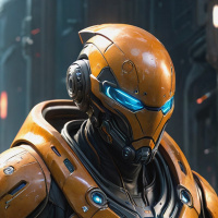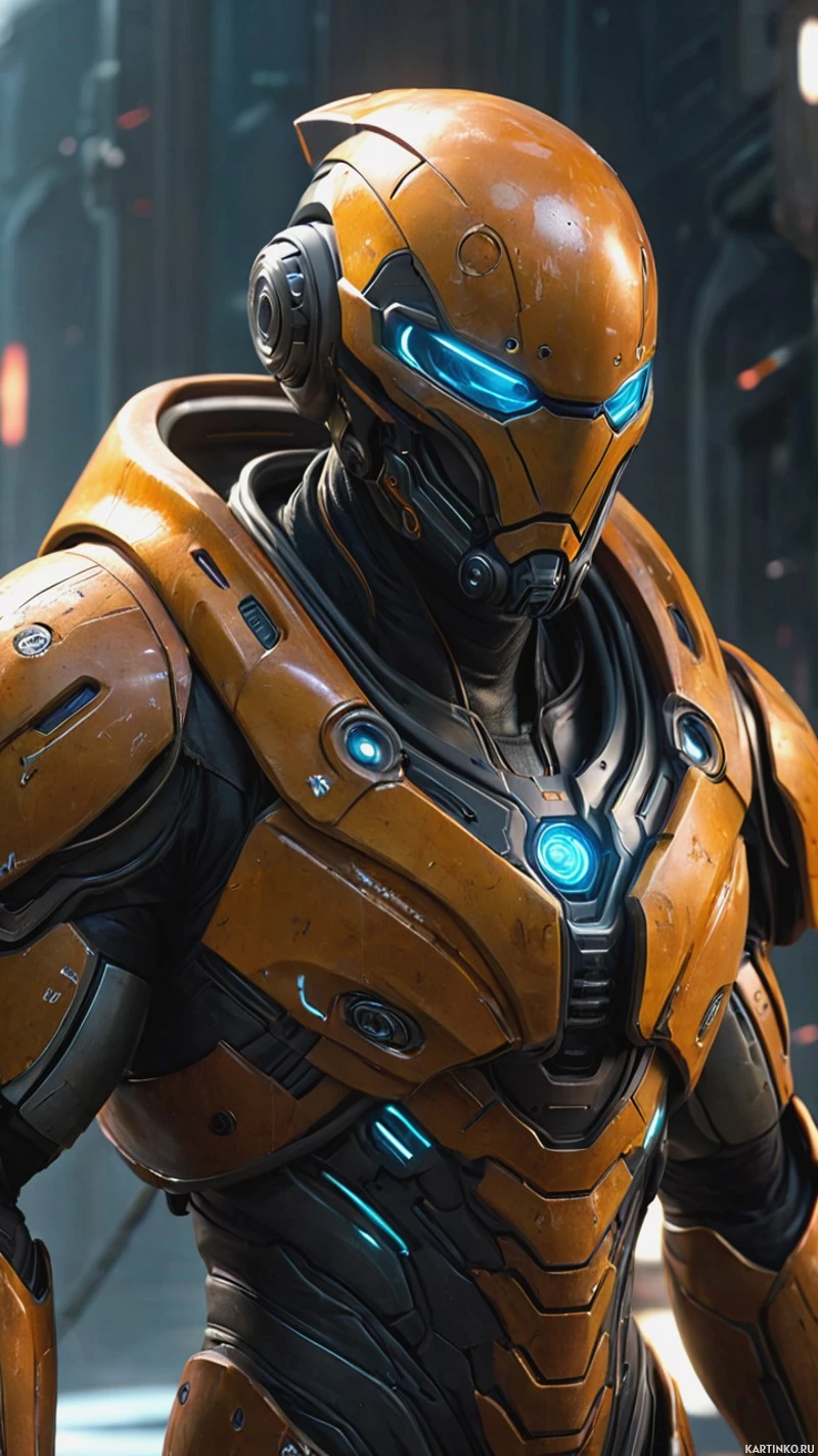 a science fiction character, depicted as an armored robot. The robot has an orange and grey color scheme, with