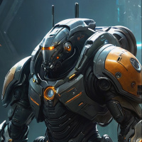 futuristic world. The robot's stance and the details of its construction give off