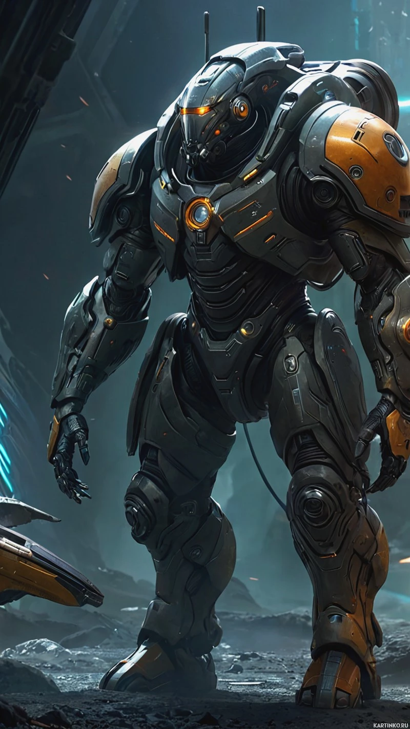 a science fiction scene featuring a robot. This robot stands tall and appears to be designed for combat or heavy labor, with