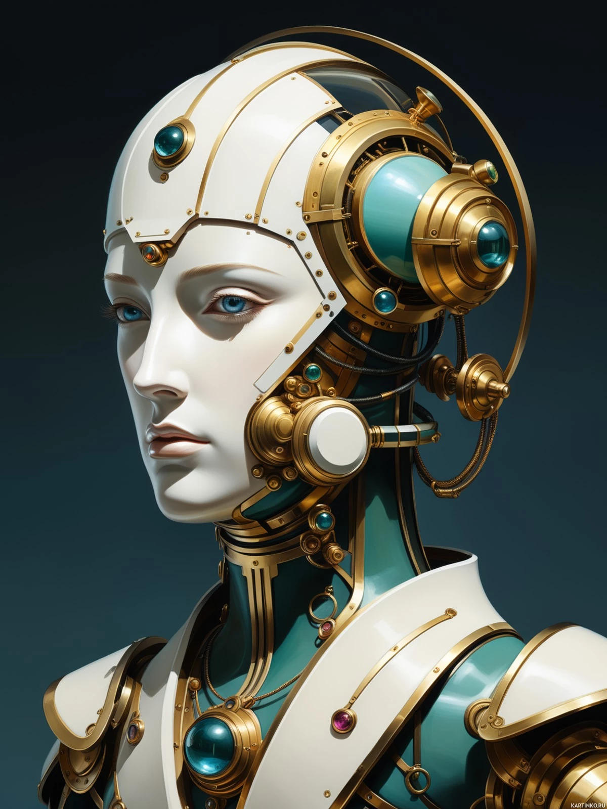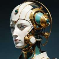 advanced technology integration. The color scheme includes white and gold tones for the robotic elements, contrasting with the natural skin tone of