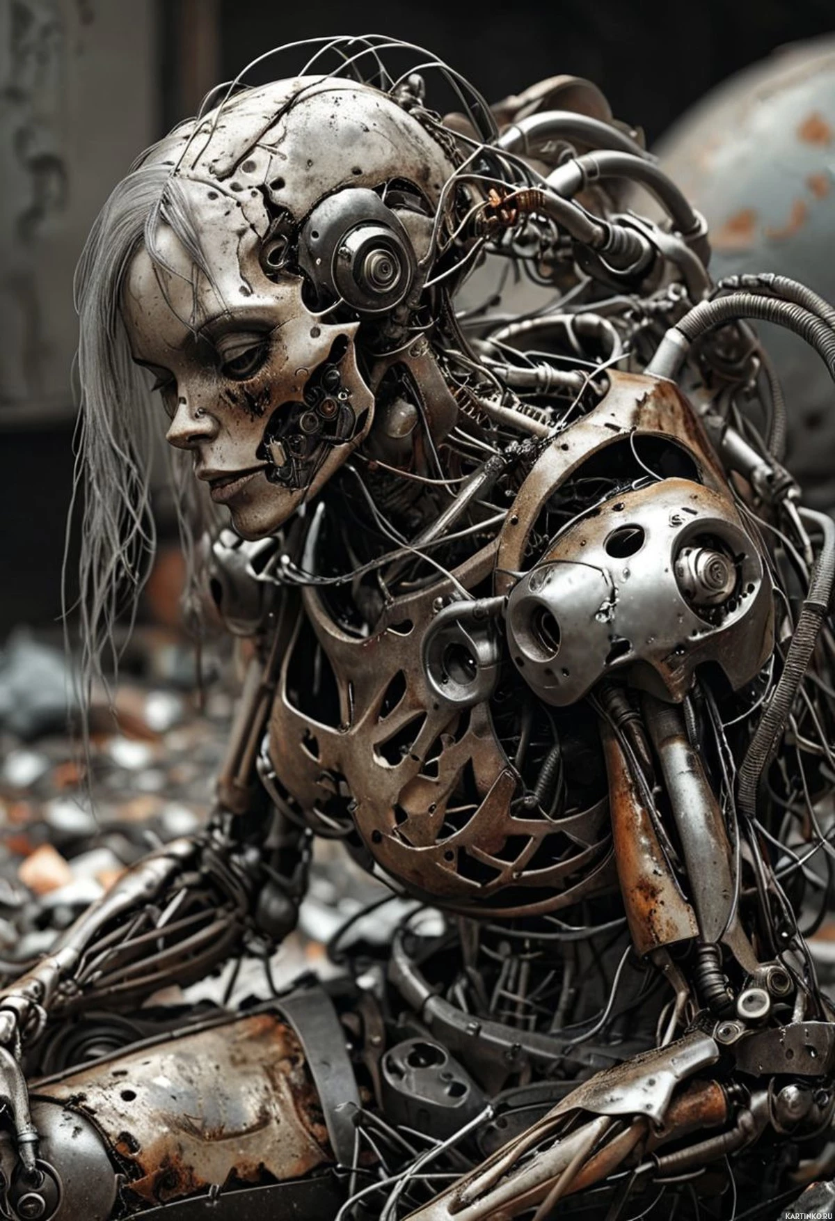 mechanical components visible on its body, including tubes, wires, and other technical parts. The overall aesthetic of the image aligns with