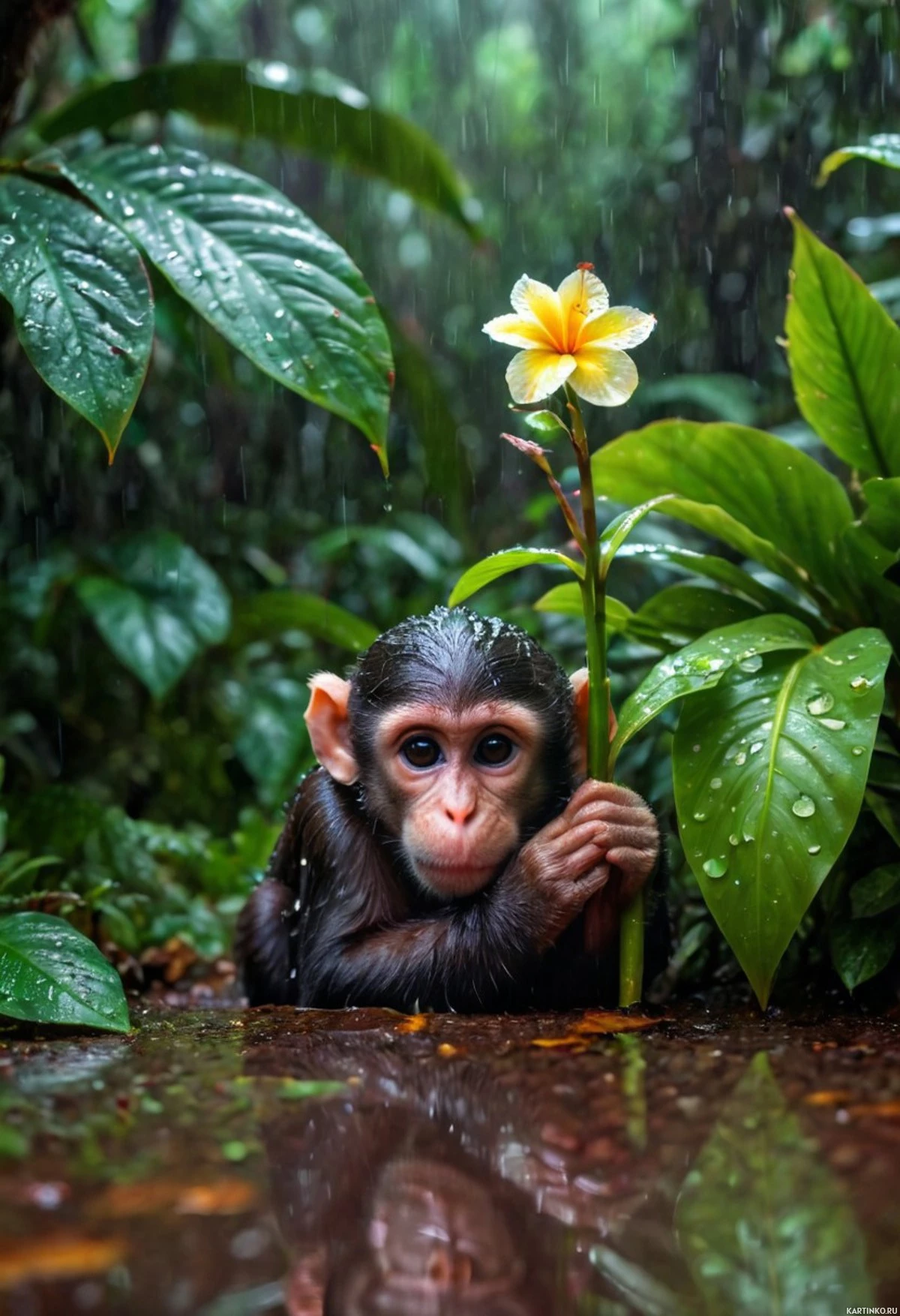 In this image, there is a monkey depicted in an illustration. The monkey appears to be looking at a flower it's holding, with
