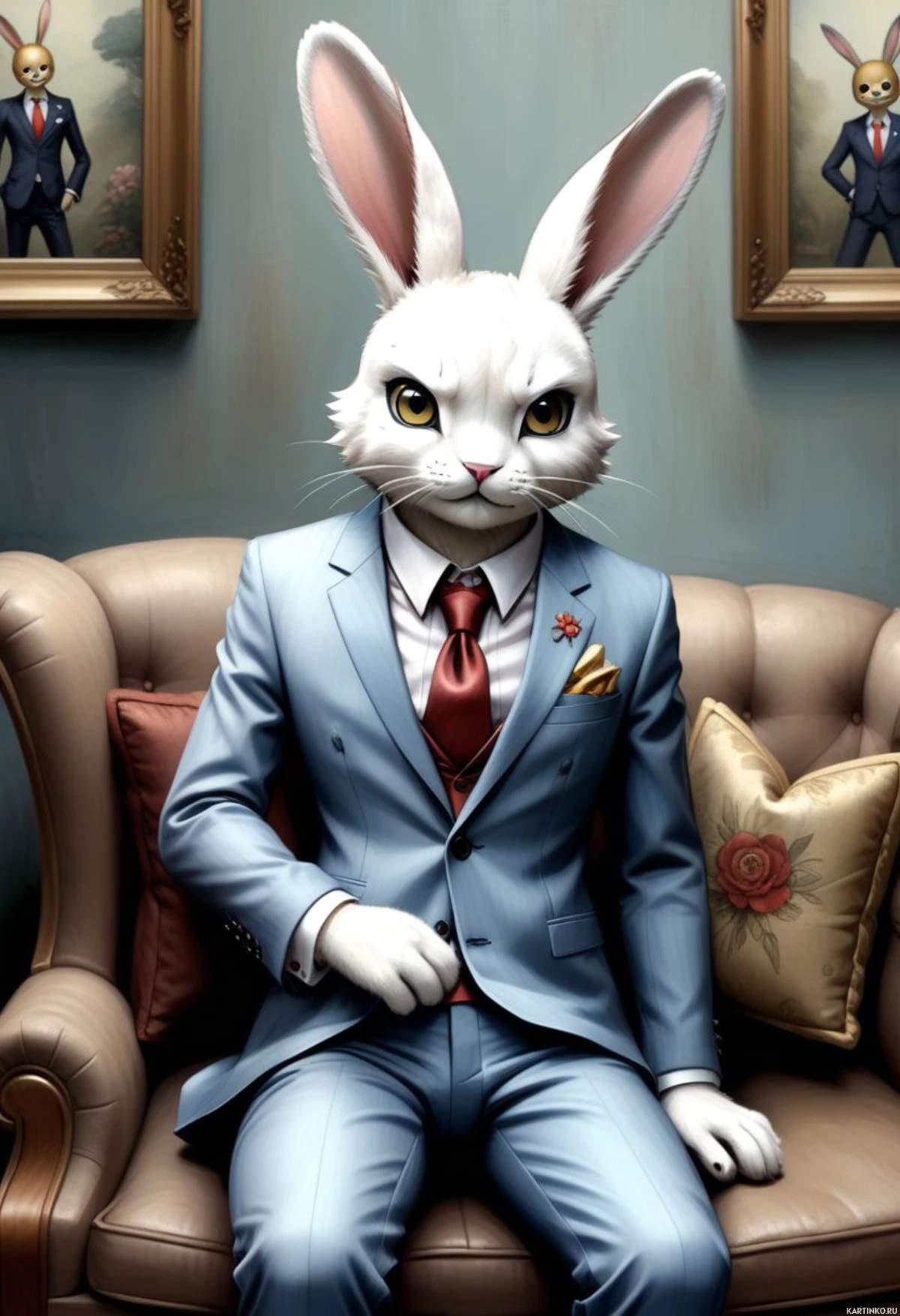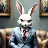 crossed legs and one hand placed on the knee. The background of the image features decorative wall elements such as paintings or photographs of other rabbit characters in similar