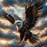 figure in the composition, has its wings fully spread out with an intensity that conveys power and freedom. Its body is angled towards us, the viewers, as if it's looking directly at us, giving
