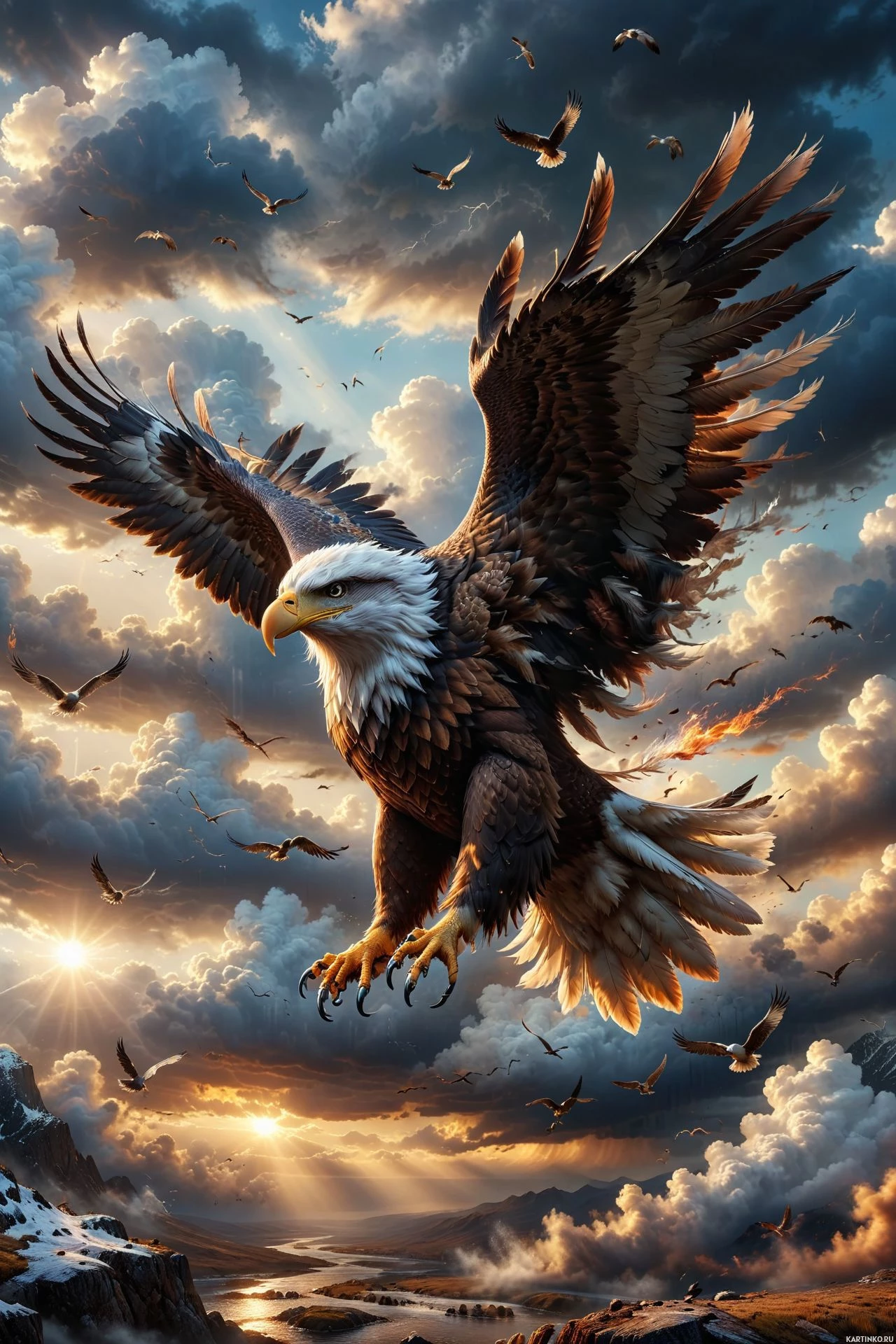 dramatic clouds and an ethereal sunset. The eagle, which is the central