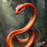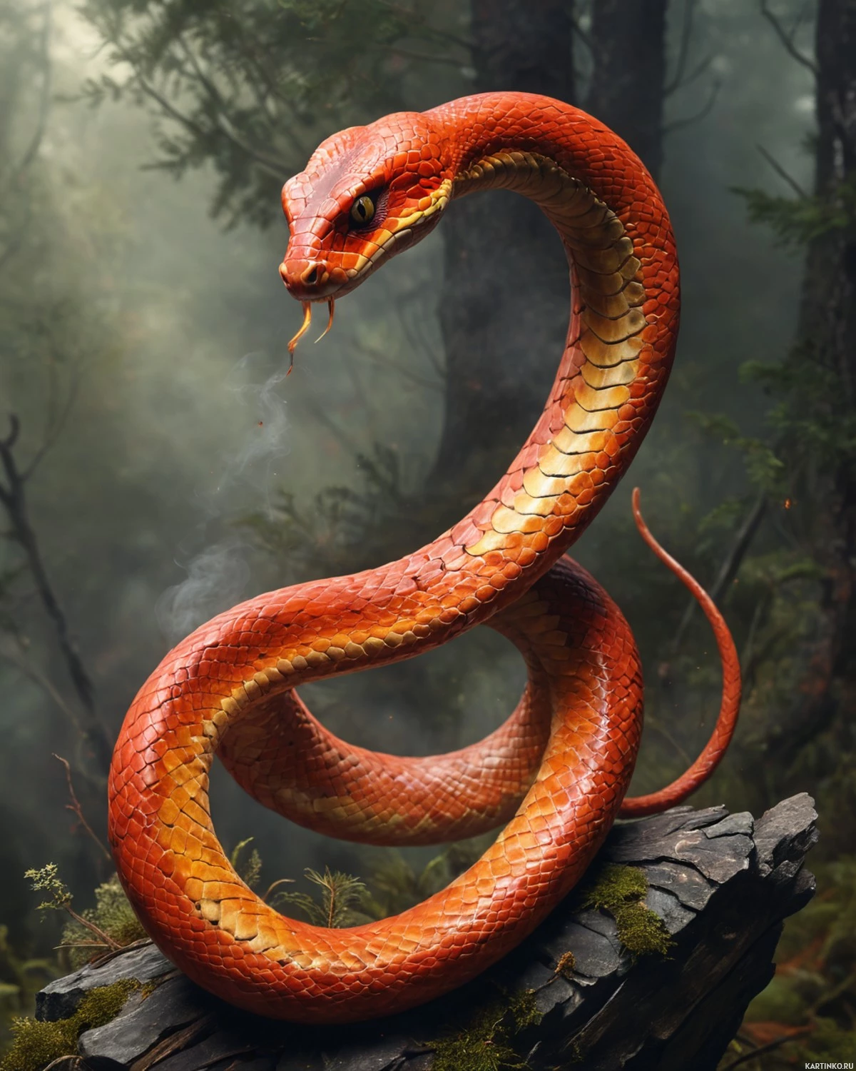The image depicts an illustration of a large, red-orange snake with scales and a detailed head. It is coiled around what appears to be the base of a tree or on top of a rock, surrounded by a misty