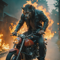 a leather jacket. It's on a street where flames are being ignited from the wheels of the motorcycle. The scene suggests an intense or dramatic situation, possibly related to fire and the animal nature represented by