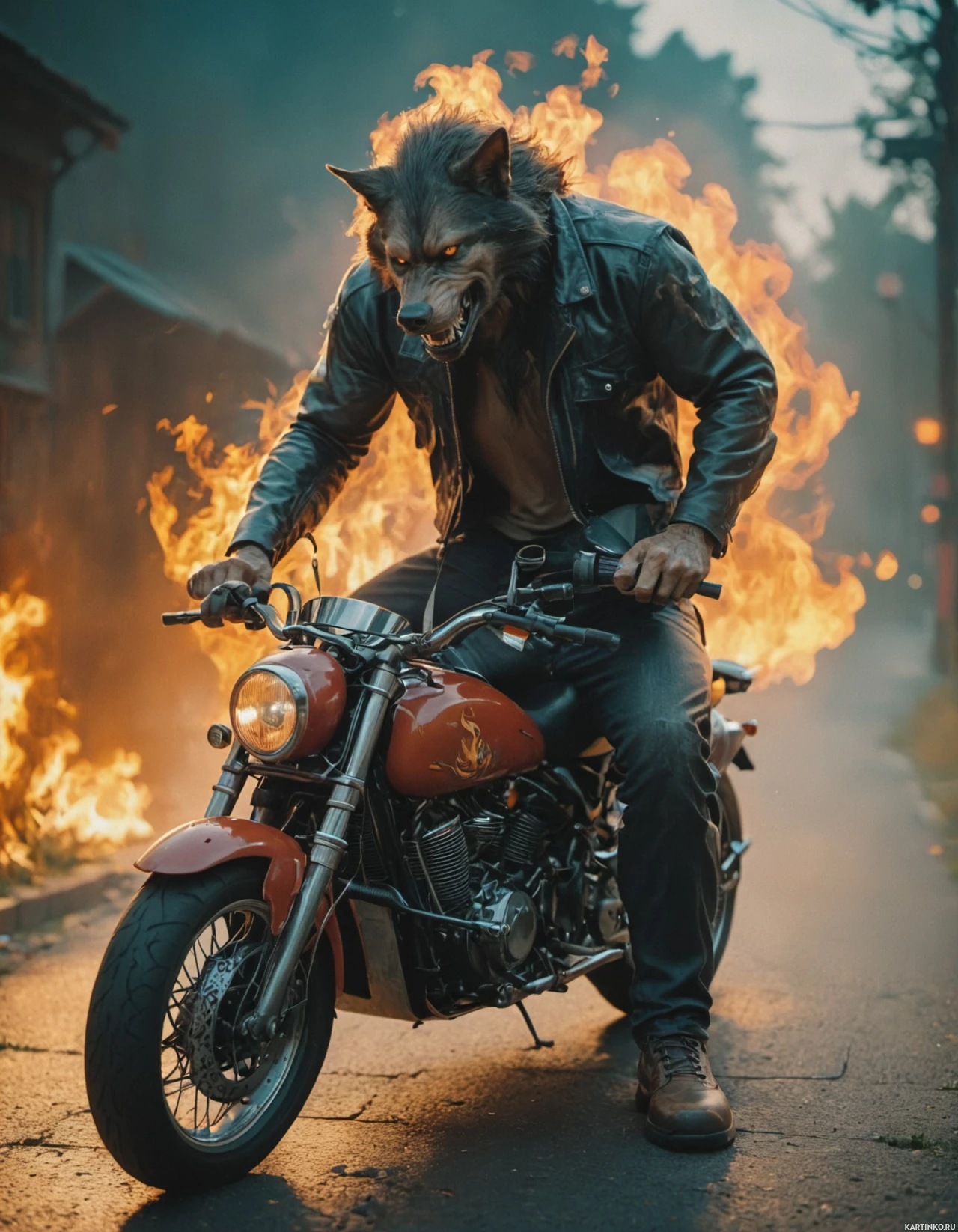 a red motorcycle. The creature has the head of a wolf and is wearing