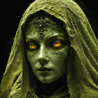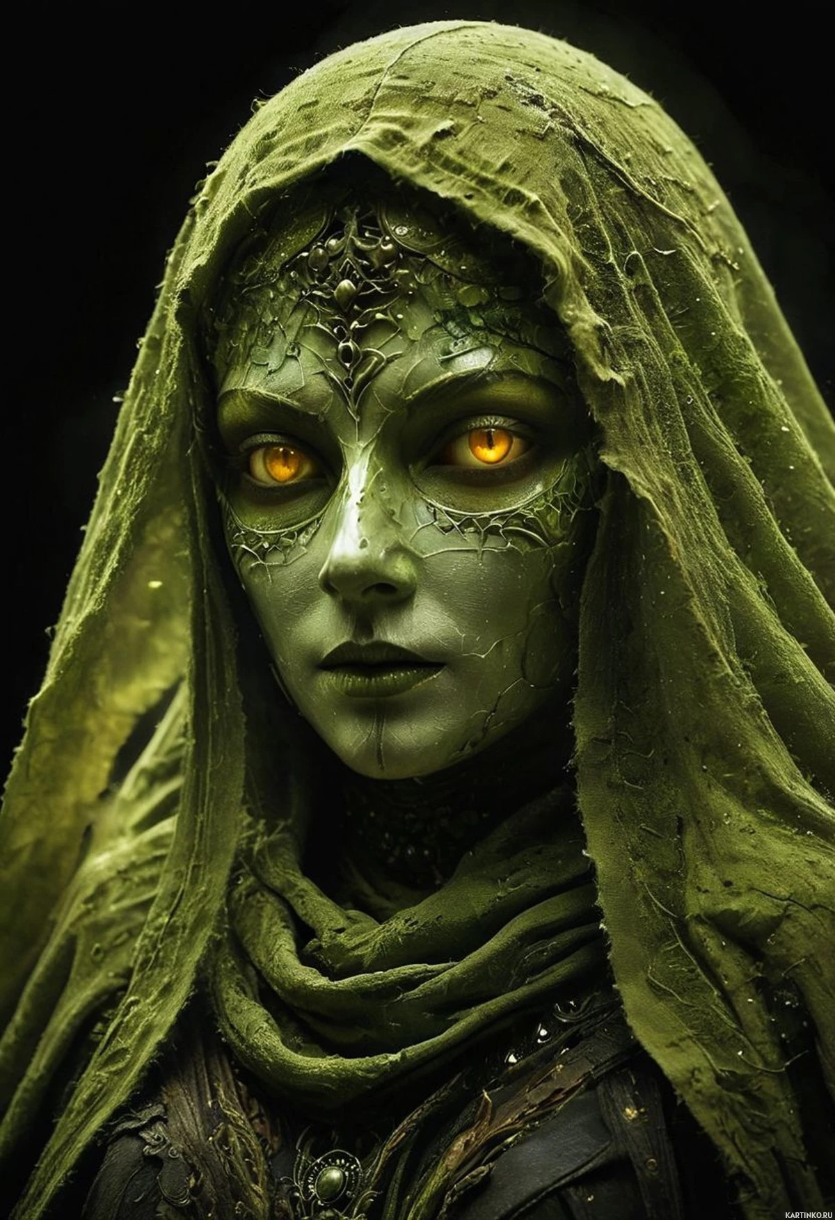 red eyes and a greenish hue on her skin. Her hair is dark and straight, extending down to the shoulders. The character is wearing a robe that drapes over one shoulder, leaving the other bare. A hood covers part of her face, and there's