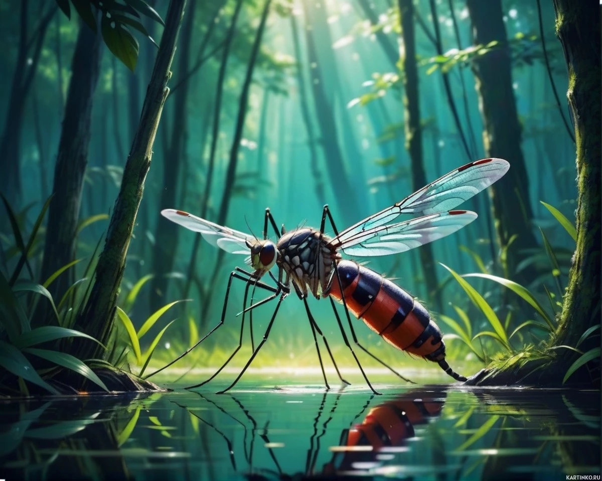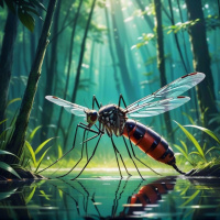 green foliage and has a vibrant orange-red color with black markings and antennae that stand upright. There are also hints of other insects around in the background, contributing to a rich diversity of wildlife. The overall scene suggests a healthy ecosystem with abundant