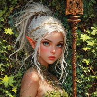 a unique armor and headdress that resemble leaves, suggesting a connection to nature or foliage. In her hand, she holds a staff which seems to be imbued with