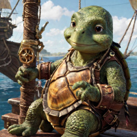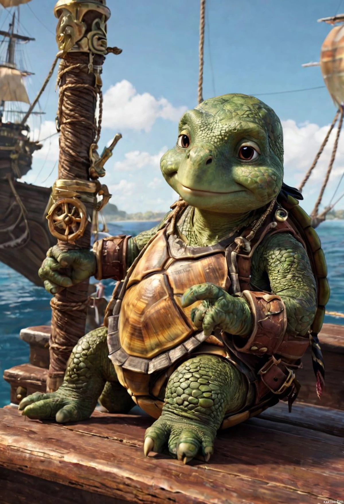turtle character sitting on a ship's deck. The turtle is anthropomorphized, meaning it has human-like qualities such as the ability to sit and express emotions. It wears a brown