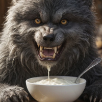 a wooden table, and there's a bowl of cream cheese or similar food item in front of it. The setting gives an impression of