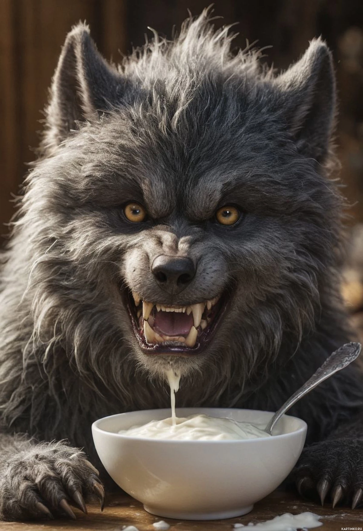 The image shows a wolf with an expression that appears to be aggressive or intense. It has long, thick fur and sharp teeth visible in its