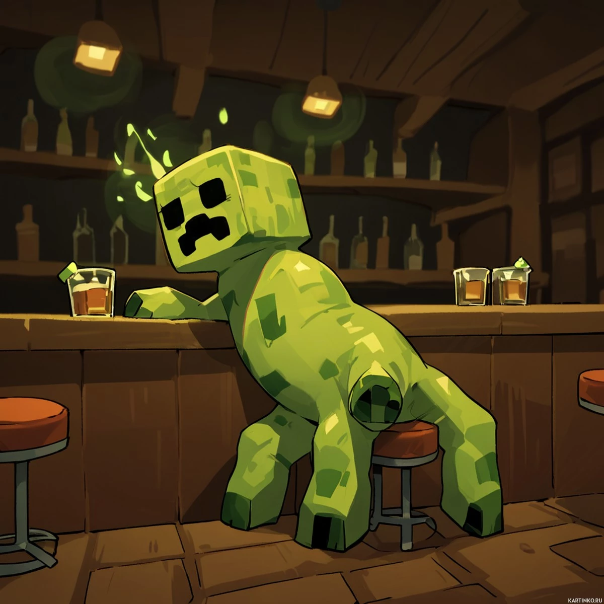 На картинке изображен мультяшный персонаж, Криипер из игры Minecraft. Он сидит на барном стуле в таверне с деревянными стенами и полкой с бутылками позади. Криипер скрестил руки на стойке, выглядит расслабленно. У него белые точки вместо глаз и нахмуренное выражение лица. Вокруг в сцене разбросаны другие, маленькие Крииперы в разных позах.