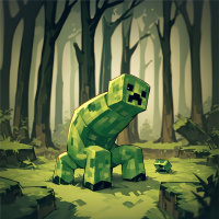 an animated character that resembles a creeper from the Minecraft game, sitting on the ground in what appears to be a forest setting. The creeper is depicted with its signature face: a white rectangle with two