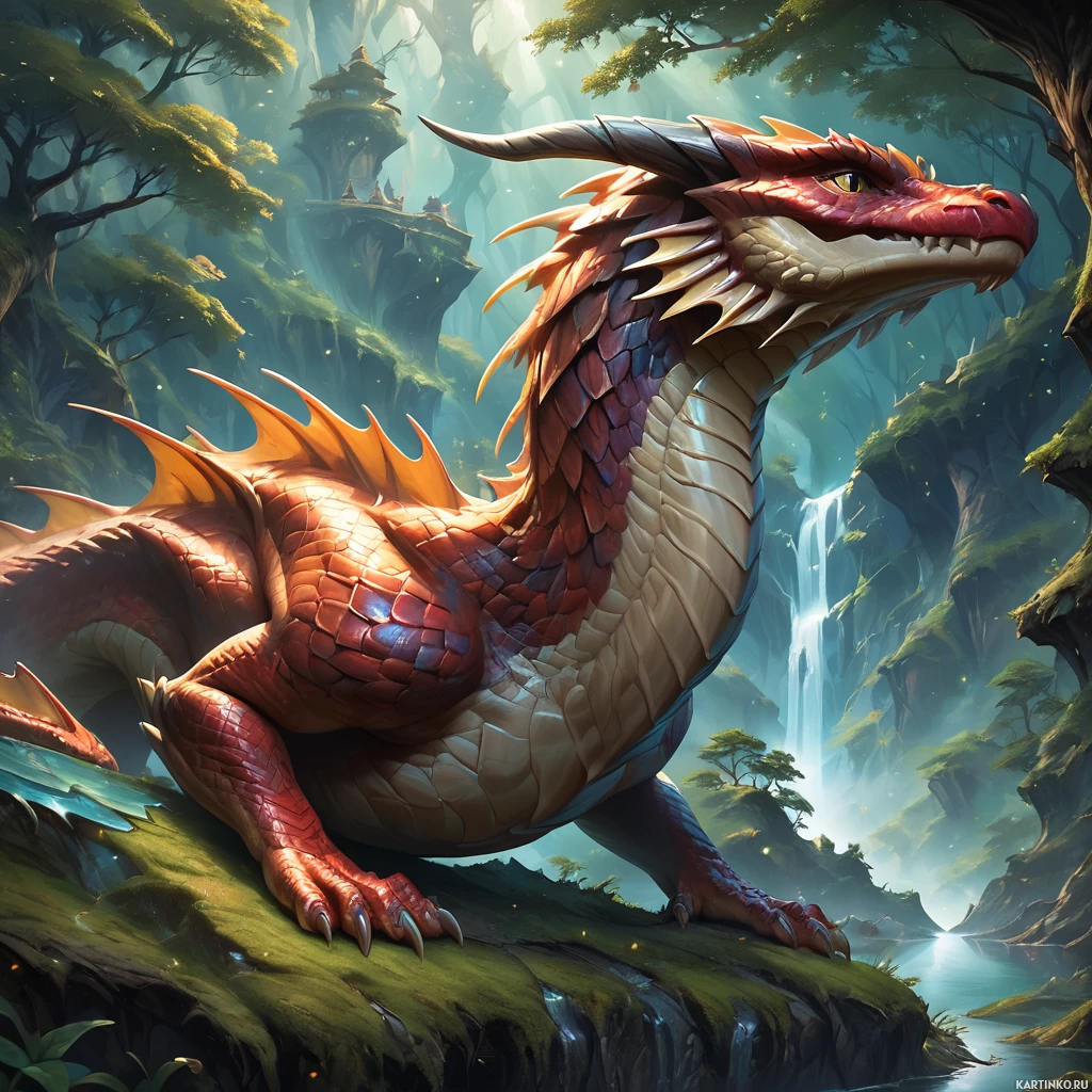 The image depicts a fantasy-themed dragon in a lush, forest environment. The dragon has vibrant red scales and