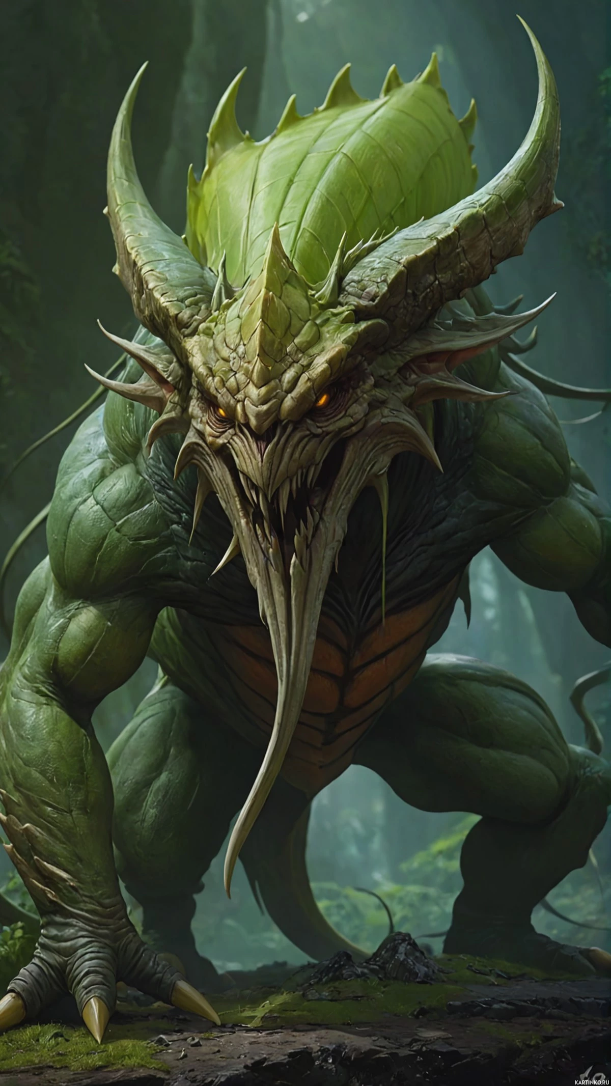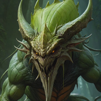 a fantastical creature that resembles a blend of a human and a serpentine monster. It has humanoid upper body features, with muscular arms and shoulders, and the lower body of a serpent, complete with scales and