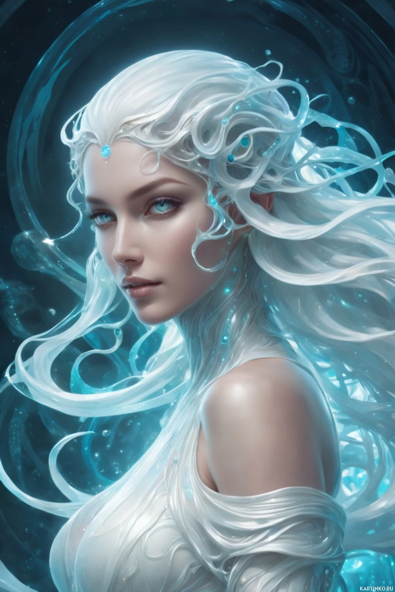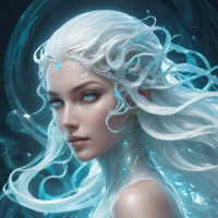 elven ears and a tattoo or mark on her neck. Her eyes are blue, complementing the overall aesthetic. She is wearing a translucent garment that suggests an ethereal quality, and there's a hint of technology, like circuit-like patterns, incorporated into her design, which might suggest she has magical abilities or is part of a technologically advanced world within