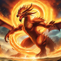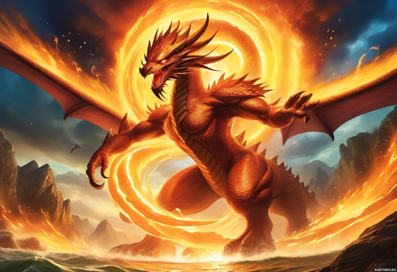 dynamic pose. The dragon is surrounded by flames that it appears to be controlling or emitting from its mouth and claws. Its wings are spread wide, and it's standing on what looks like