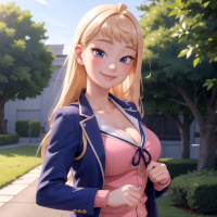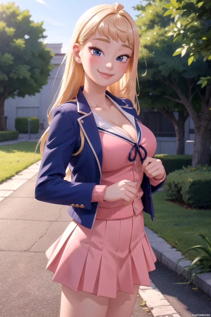 blonde hair and is wearing a school uniform consisting of a blue blazer with gold accents, pink shorts, and white thigh-high socks. Her outfit includes a tie that matches her blazer. The background suggests