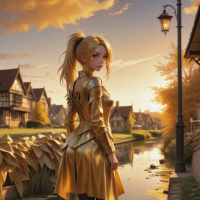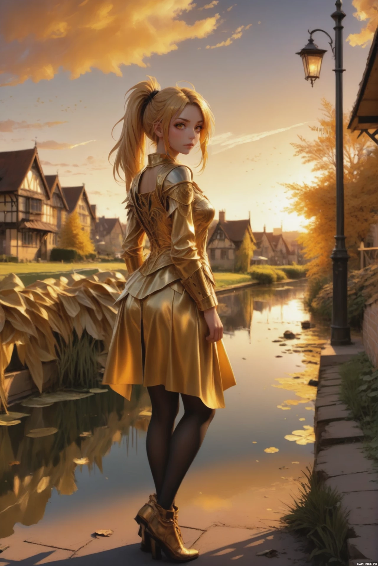 the warm tones of the sky and the reflection on the ground. The girl is dressed in