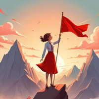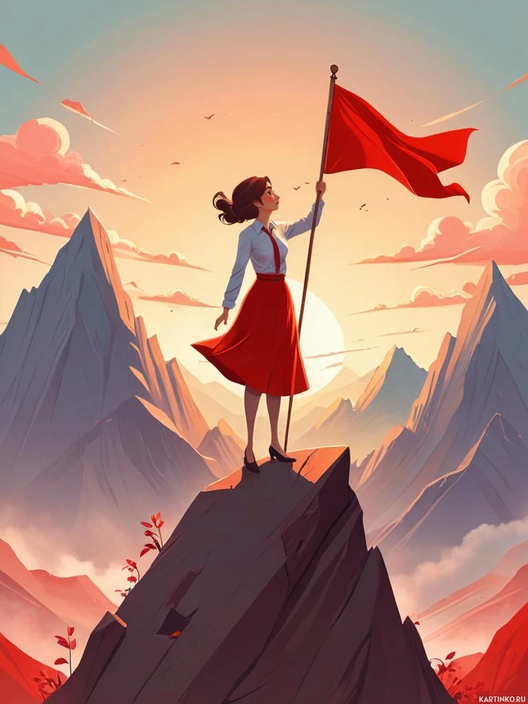 a red flag with one hand and the pole of the flag in the other. Her hair is styled in an updo, and she is wearing a vintage-style dress with