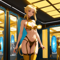 blonde hair and is wearing a gold-colored, form-fitting outfit that resembles a bodysuit with high heels. Her pose suggests she is confident or poised. In the background, there's an environment that looks like part of a spacecraft or station with metallic walls, illuminated by what appears to be